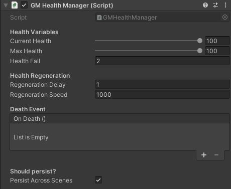 The health manager controls how the health will be displayed, how fast health will fall and the parameters surrounding player death. All can be controlled with these variables and the simple event for death.