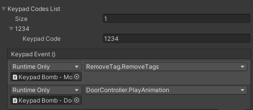 | **Code List**                 | <ul><li>Set the array size to add more code options</li><li>Inside each option is a <strong>Codes</strong> to set the code you would like player to input</li><li>Then an event to activate when this code is input into the keypad</li></ul> |