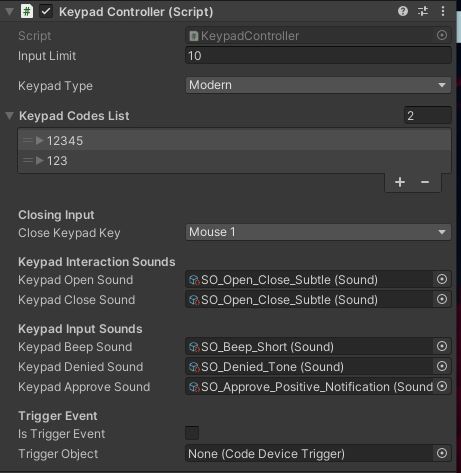 | **Keypad Interaction Sounds** | Add the ScriptableObject objects from the corresponding folder                                                                                                                                                                                |