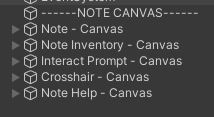* Add each canvas to control the notes, inventory, interact prompts, crosshair and note help (All can be found in the prefabs folder)